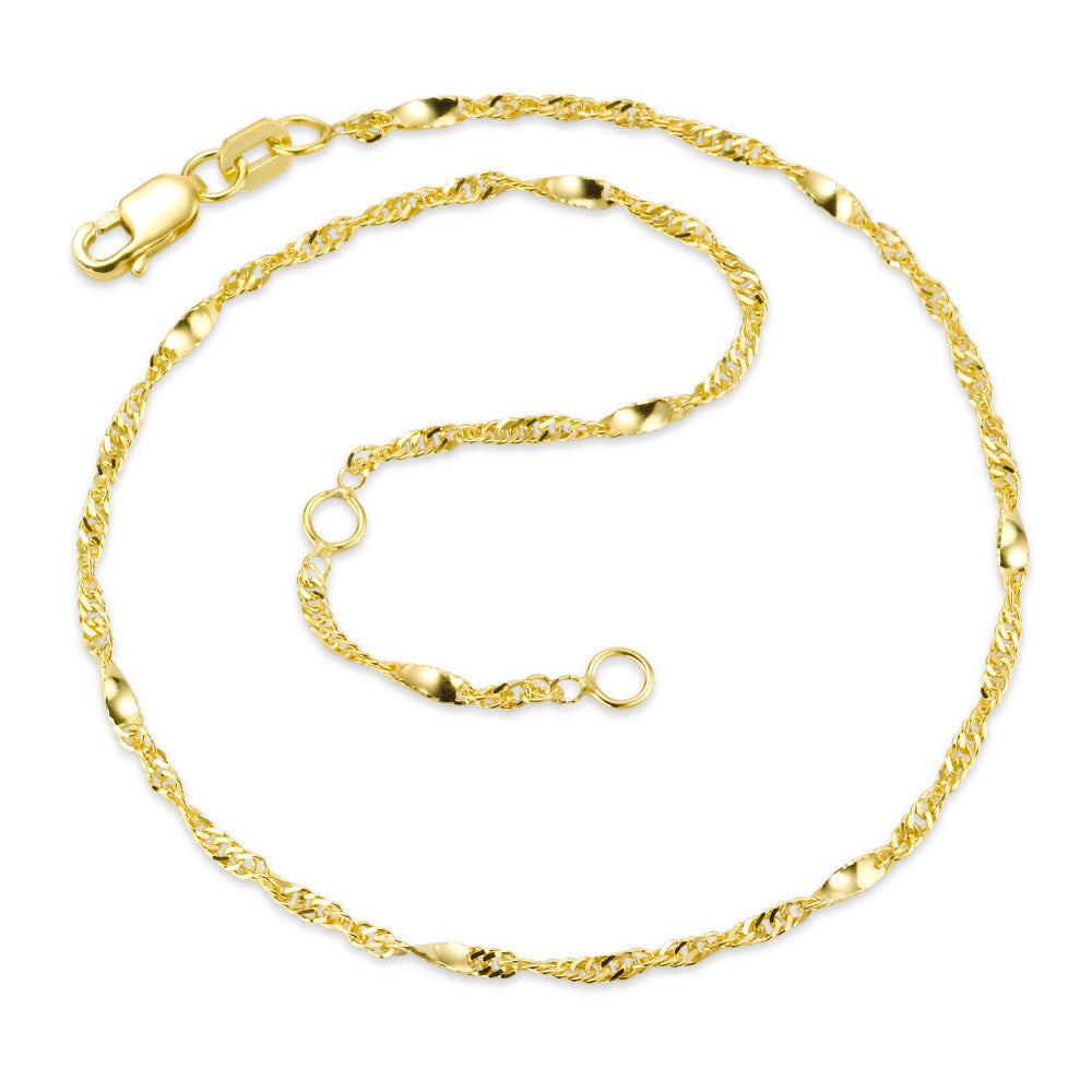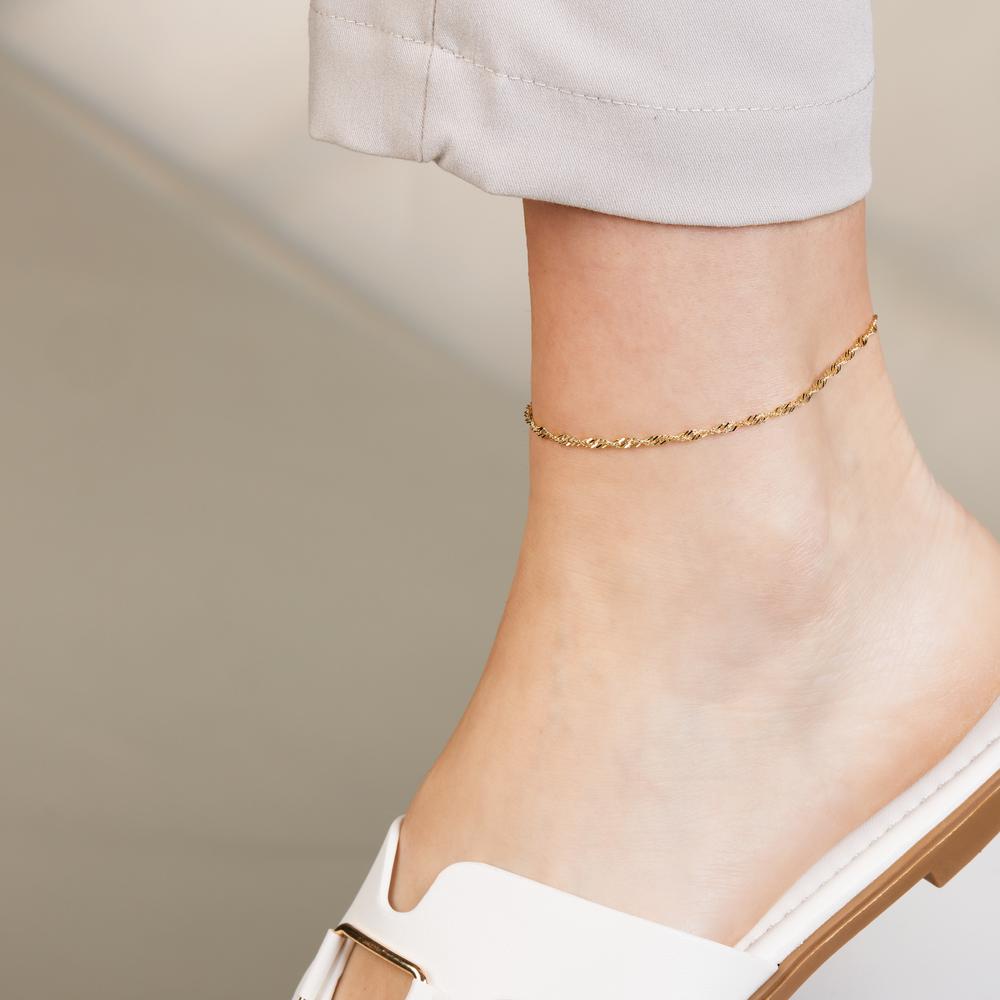 Elegant dames fodkæde i 375 guldbelagt guld. Kæden har et unikt snoet design, der tilføjer glans og raffinement til dit look. Perfekt til at fremhæve anklen på varme sommerdage eller som et subtilt smykke året rundt. Et stilfuldt must-have til enhver smykkesamling.