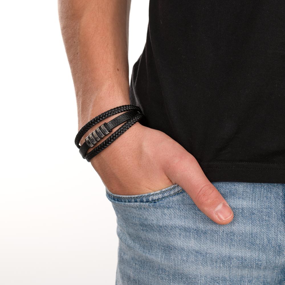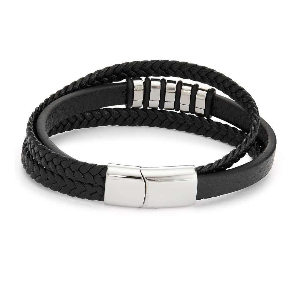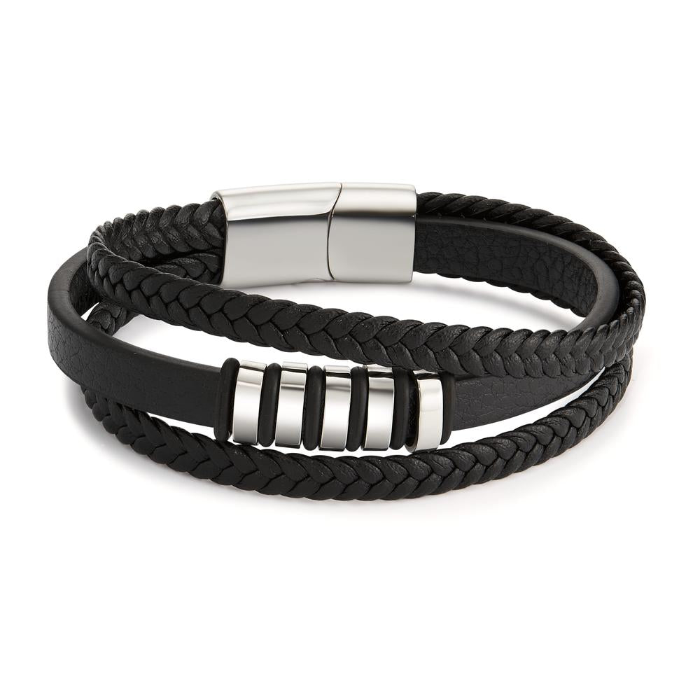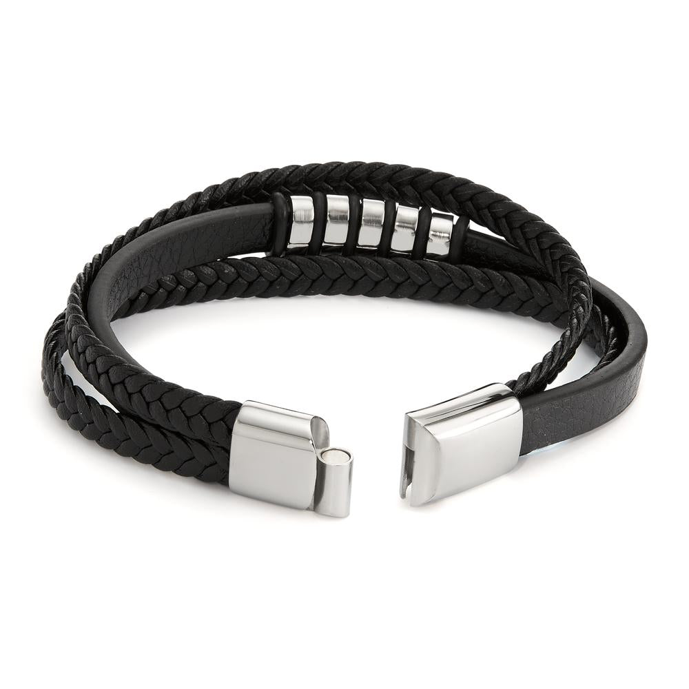 Stilfuldt herrearmbånd lavet af ægte sort læder kombineret med elegante rustfri ståldetaljer. Det flettede design giver et maskulint og moderne udtryk. Perfekt til både hverdag og fest, med magnetlås for nem påtagning og komfortabel pasform.