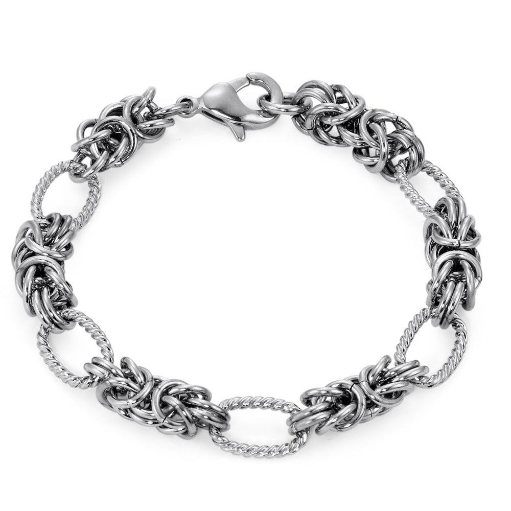 Elegant damearmbånd i rustfrit stål med flettet design og kombination af glatte og vridne led. Dette stilfulde armbånd er både holdbart og moderne, perfekt til hverdagsbrug eller festlige lejligheder. Justerbar længde og sikker lås sikrer en god pasform.