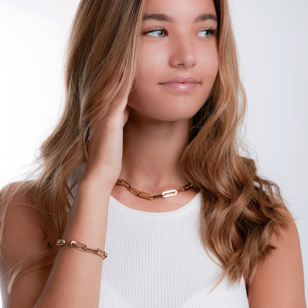 Smukt damearmbånd i rustfrit stål med en moderne kæde i forgyldt finish. Dette tidløse smykke tilføjer et elegant touch til enhver påklædning og er perfekt til både hverdag og særlige lejligheder. Let og holdbart design sikrer komfort hele dagen.