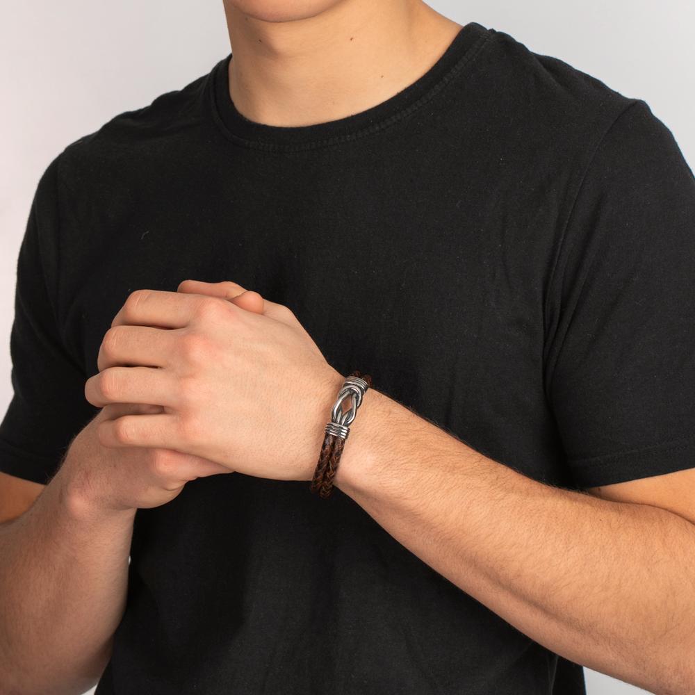 Maskulint armbånd til mænd i flettet læder med rustfri stål-detaljer. Det robuste design kombinerer naturlig elegance med moderne stil og sikrer både komfort og lang holdbarhed. Perfekt som et tidløst accessory til enhver anledning.