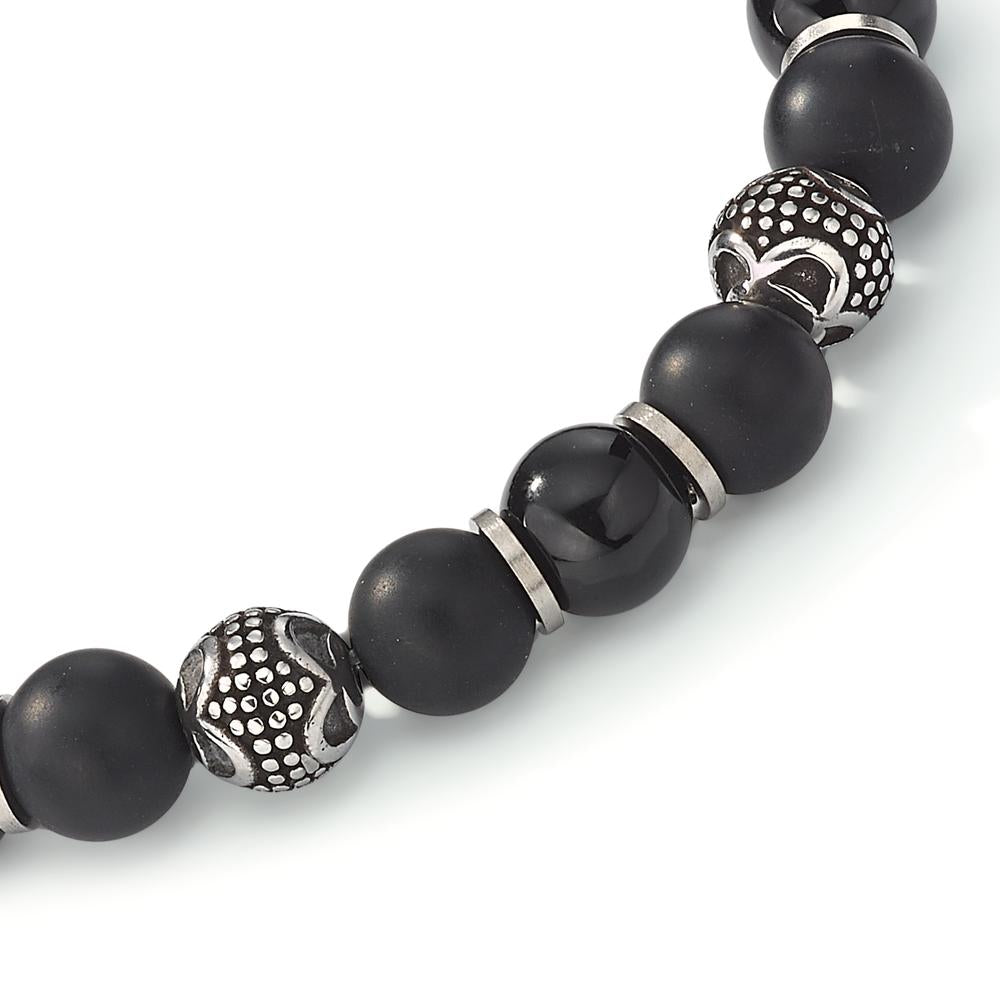 Stilfuldt herrearmbånd i børstet rustfrit stål og sort onyx. Perlerne er sammensat på elastik, hvilket sikrer en behagelig pasform. Et maskulint og tidløst smykke, der passer til enhver anledning og tilføjer et diskret, men markant touch til dit look.