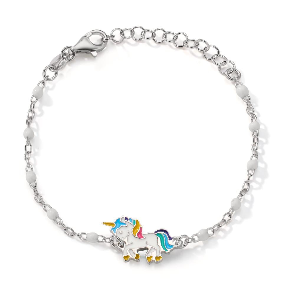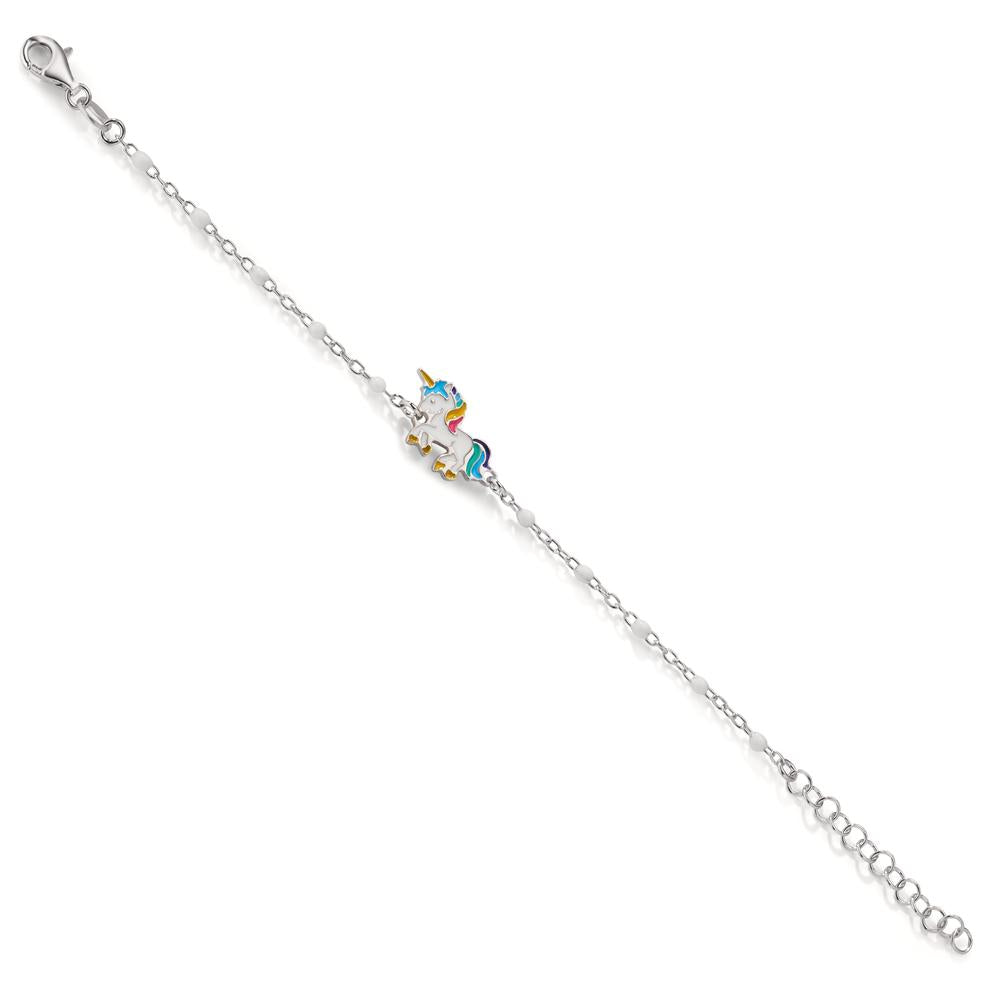 Sødt børnearmbånd i ægte sølv med et farverigt enhjørningvedhæng. Armbåndet har små hvide perler og en justerbar lås, der passer perfekt til små håndled. En charmerende gaveidé til børn, der elsker magi og fantasi. Robust og sikker til daglig brug.