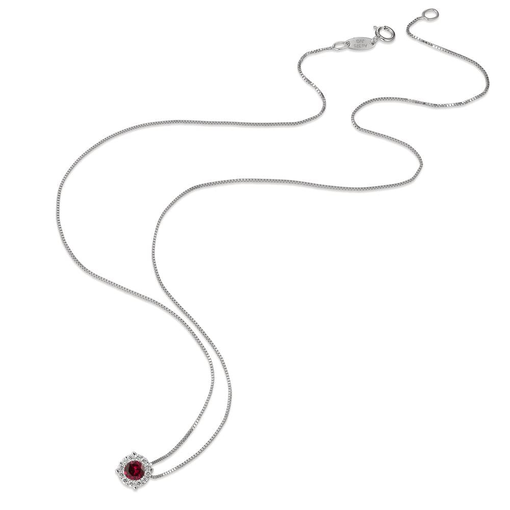 Smukt damehalskæde i 375 hvidguld med en funklende rød zirkonia omkranset af klare zirkonia-sten. Elegant og tidløst design, der passer til enhver lejlighed. Perfekt som gave eller til at forkæle dig selv med en sofistikeret touch.