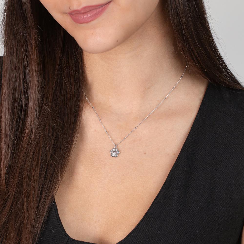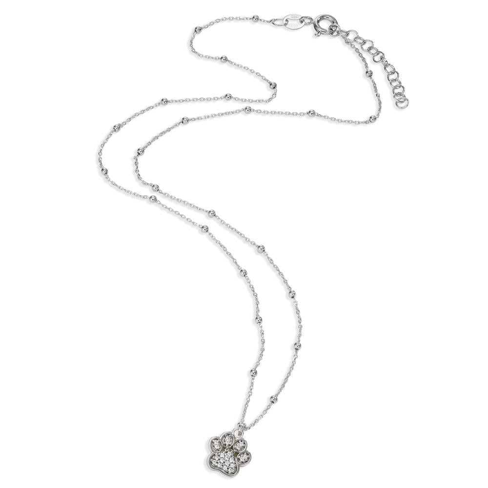 Smukt damehalskæde i sølv med en charmerende pote vedhæng dekoreret med funklende zirkonia-sten. Perfekt til dyreelskere, der ønsker et elegant og personligt smykke. Kæden har små sølvkugler for et stilfuldt finish. En tidløs gaveidé.
