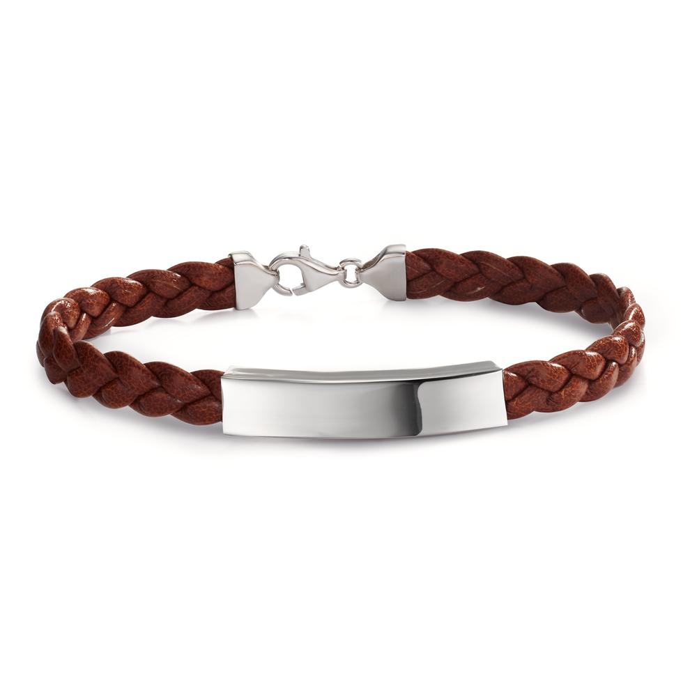 Flot og stilfuldt graveret armbånd med flettet brunt læder og en blank sølvplade, der kan personliggøres med navn eller tekst. Perfekt som gave eller som et unikt smykke til dig selv, der kombinerer elegance og naturligt materiale. Justerbar lukning sikrer en god pasform.