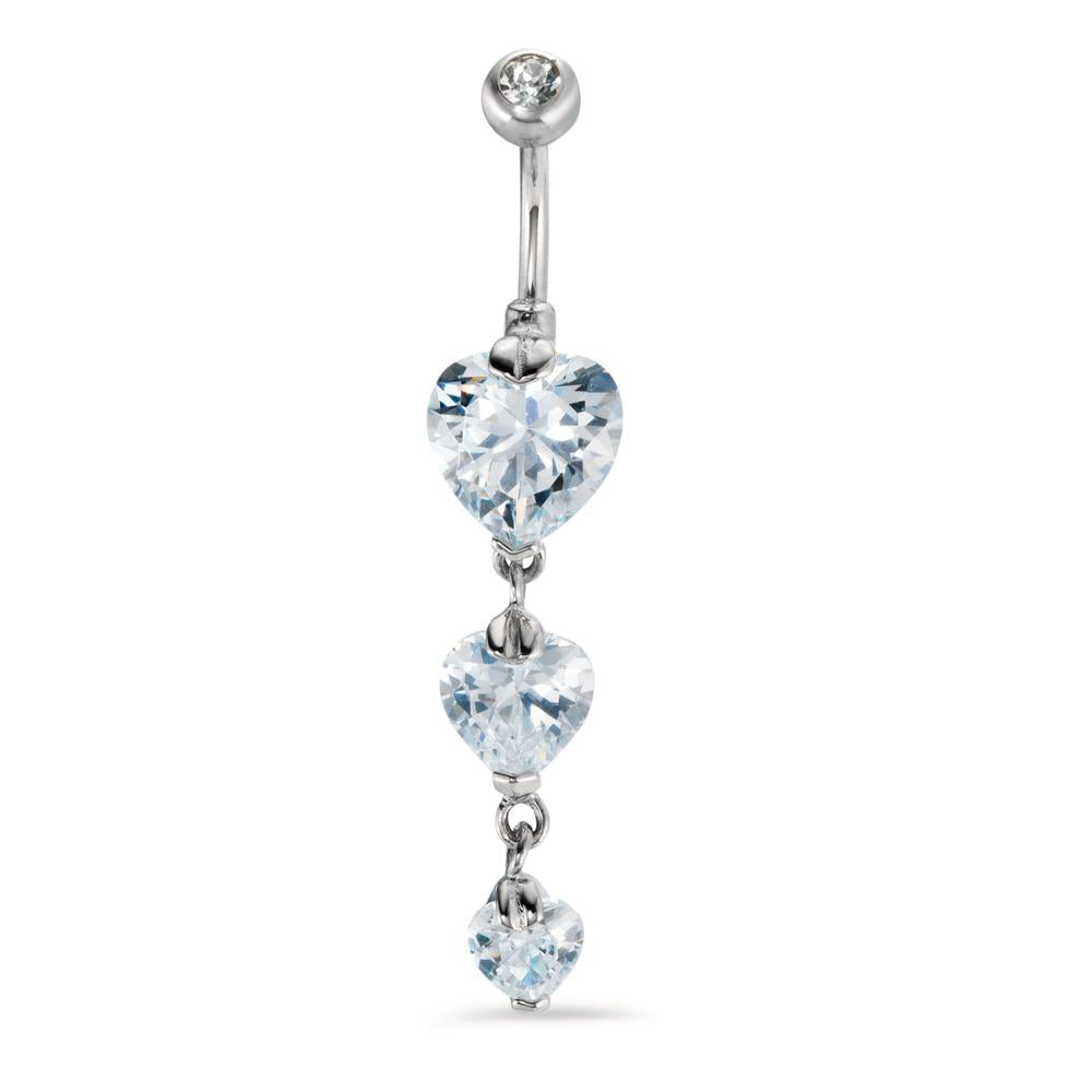 Elegant navlepiercing til kvinder i rustfrit stål med funklende krystaller formet som tre hængende hjerter. Et smukt og feminint smykke, der tilføjer et glimt af kærlighed og stil til dit look. Perfekt til daglig brug eller særlige lejligheder.