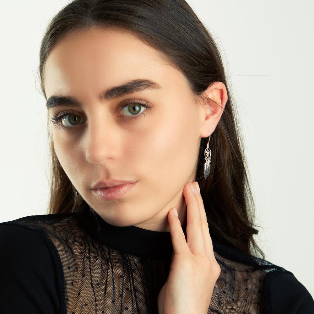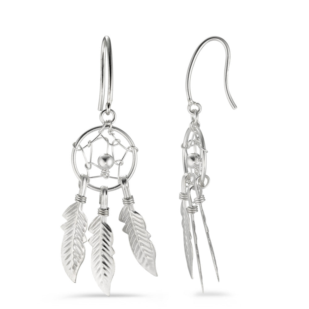 Smukke dames ørehængere i sølv med drømmefanger-design. Med fine fjerdetaljer og en elegant rund ramme, der symboliserer beskyttelse og positive drømme. Perfekte til både hverdag og fest, og en unik gaveidé til enhver lejlighed. Letvægtige og behagelige at bære.