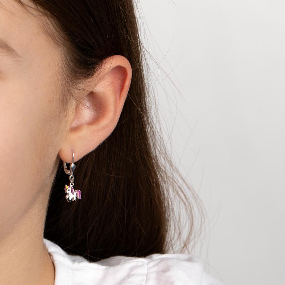 Søde ørehængere til piger i sterling sølv med fine enhjørninge-vedhæng i hvid og pink emalje. Lette og behagelige at have på, perfekte til hverdag eller fest og en fantastisk gaveidé til små enhjørningselskere. Varighed og kvalitet i smukt design.