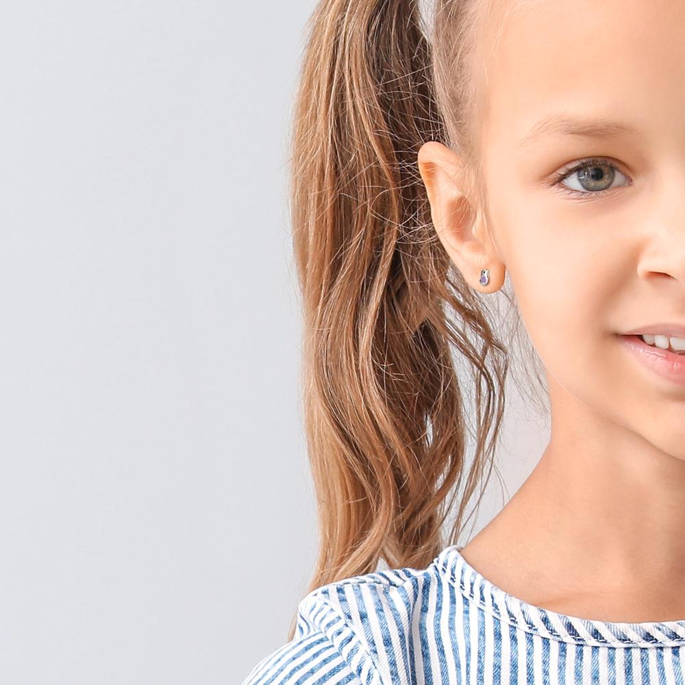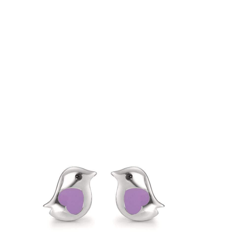 Søde øreringe til piger i sølv med en fin fugleform. Øreringene har en lilla emaljehjerte på siden og sorte øjne, der giver et charmerende og legende udtryk. Perfekte som hverdagsaccessory eller som gave til den lille pige. Hypoallergenisk og behagelig at have på.