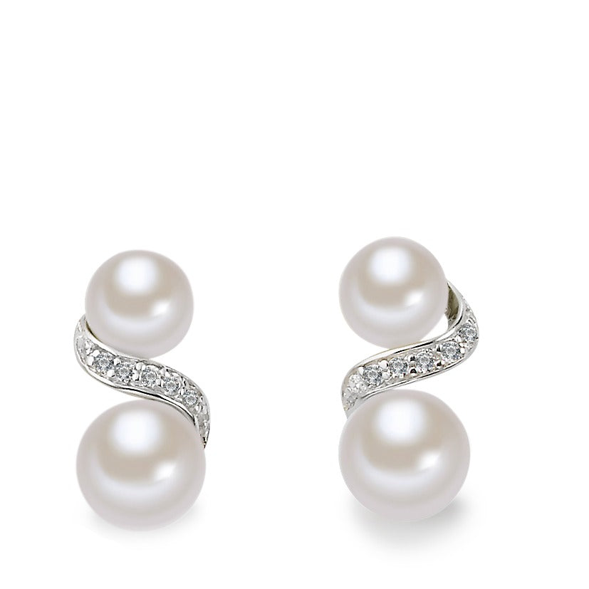 Smukke dames Ørestikker i sølv med ægte ferskvandsperler og glitrende zirkonia. Elegant design med to perler, der er forbundet af en snoet sølvstolpe pyntet med funklende sten. Perfekte til både hverdag og fest, der tilføjer et classy touch til dit outfit.