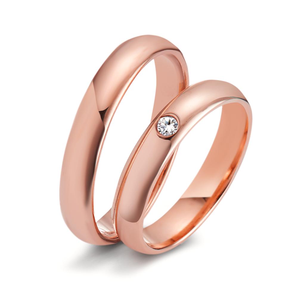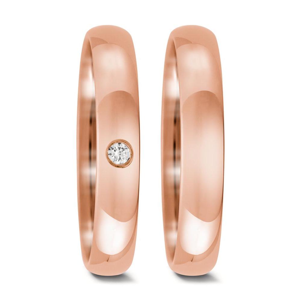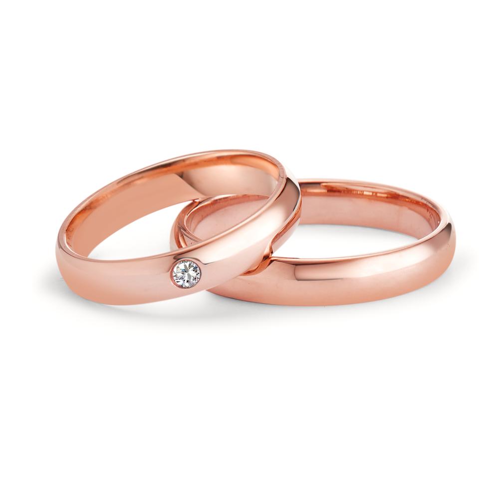 Elegant forlovelsesring i 750 rødguld med en klassisk og tidløs rund form. Denne fine ring symboliserer kærlighed og samhørighed, lavet med høj kvalitet og håndværk. Perfekt som parring til at fejre jeres unikke forbindelse.