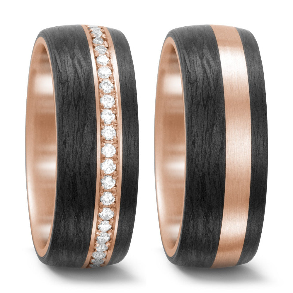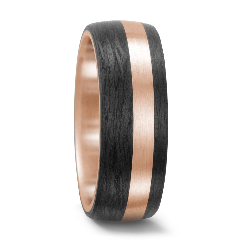 Partnerskabring i 750 rødguld og kulfiber. Kombinationen af varmt rødguld og det moderne, lette kulfiber giver en unik kontrast og et stilfuldt udtryk. Perfekt til jer, der ønsker et elegant og tidløst smykke som symbol på jeres kærlighed.