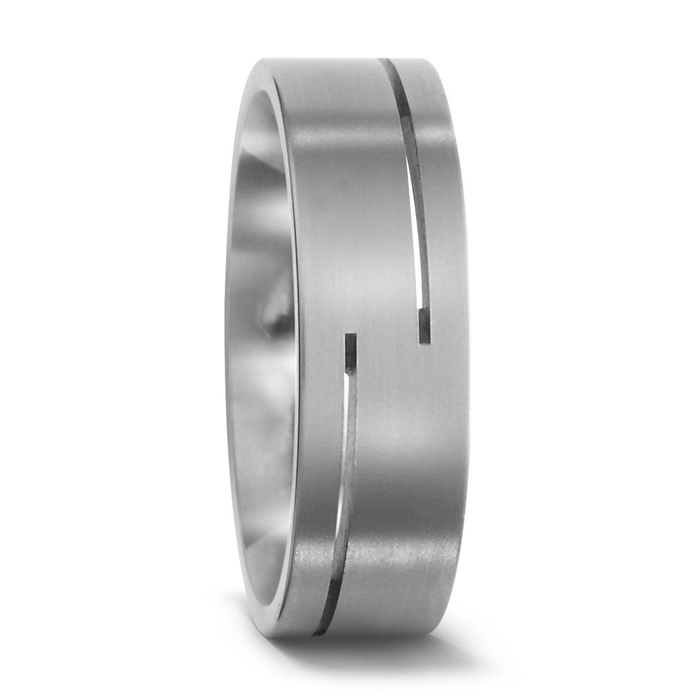 Moderne partnering i titan med mat finish og elegante indgraveringer. Denne holdbare, lette ring er perfekt til dem, der ønsker et stilrent og tidløst symbol på kærlighed. Titan sikrer komfort og langvarig glans, ideel til daglig brug.