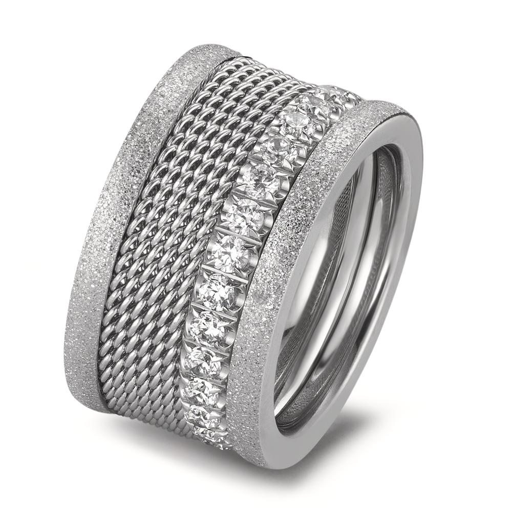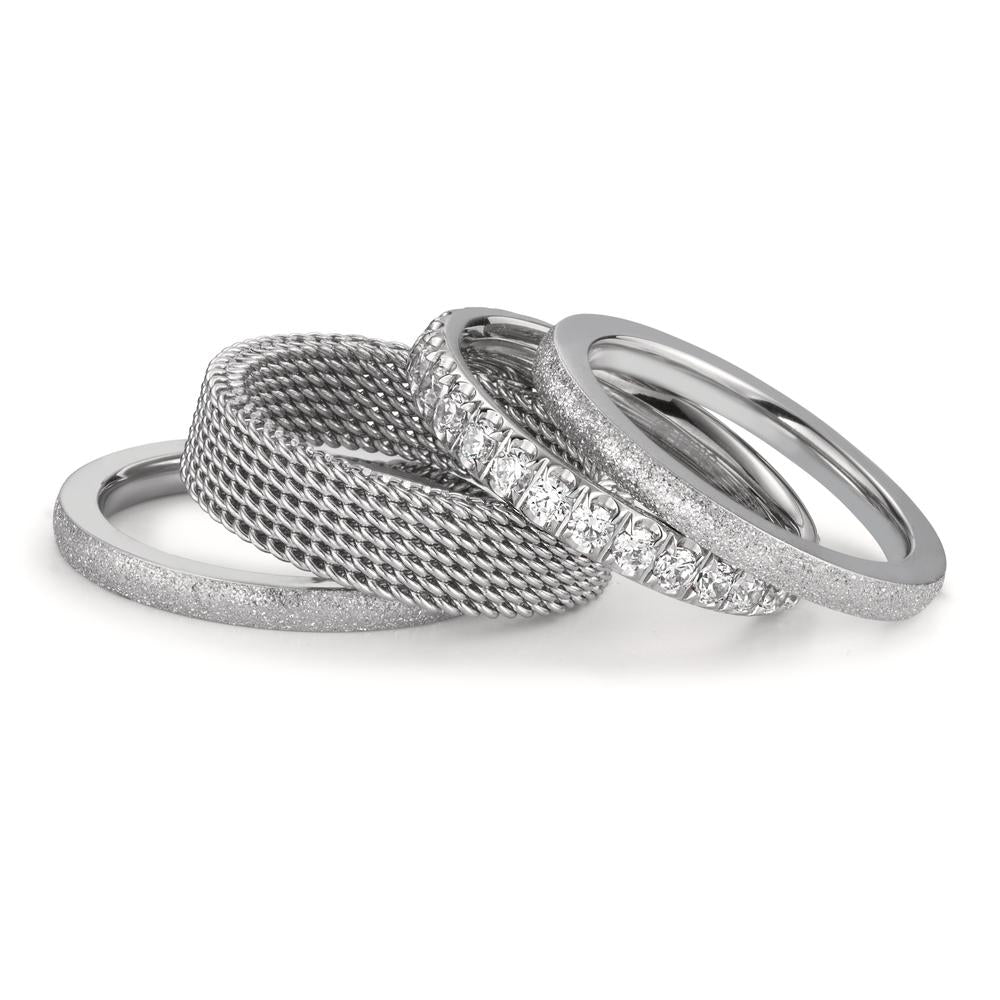 Elegant dames ringesæt med skinnende zirkonia sten. Det unikke design kombinerer glat og struktureret finish for et moderne og stilfuldt look. Perfekt til både hverdag og fest, tilføjer dette sæt et sofistikeret touch til ethvert outfit. Fremstillet i kvalitetsmaterialer med lang holdbarhed.