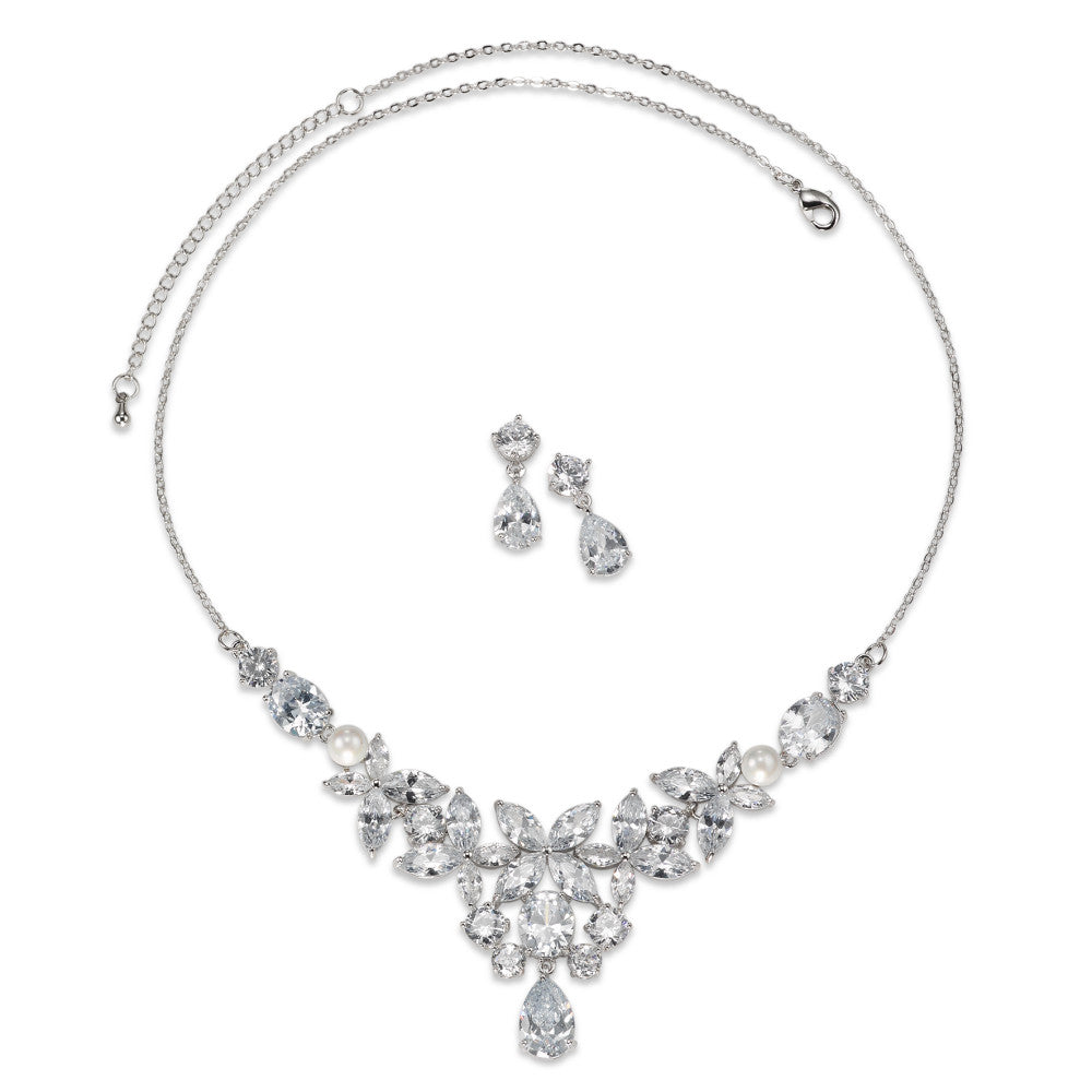Smukt damesæt i metall med skinnende zirkonia og perle-detaljer. Sættet består af en elegant halskæde og matchende øreringe, der tilføjer et sofistikeret og glitrende touch til ethvert outfit. Perfekt til festlige lejligheder eller som gave.