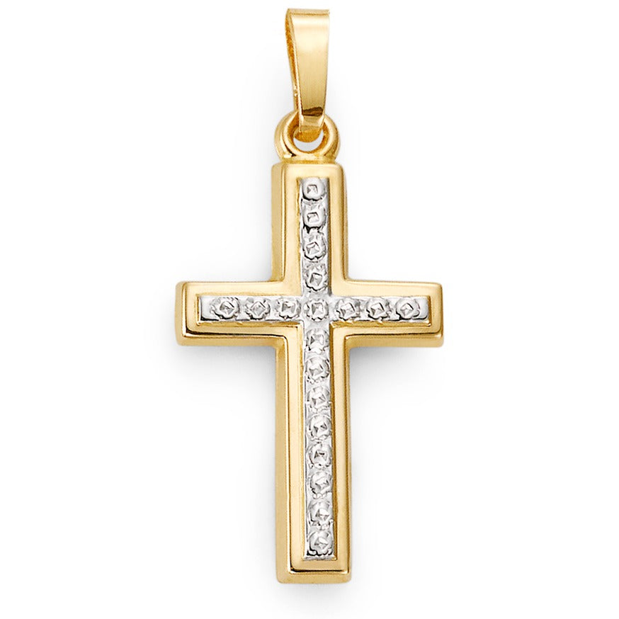 Smukt korsvedhæng i 750 gult guld med en elegant hvidguldsskinne indlagt på forsiden. Klassisk design, der passer perfekt til enhver kæde. Et tidløst smykke, der symboliserer tro og stil, ideelt som gave eller til daglig brug. Et fint og solidt valg i høj kvalitet.