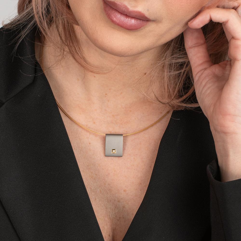 Elegant damesvedhæng i titan med 750 gulgulddetalje og en skinnende diamant. Det matte titan og den varme gulguld skaber et stilfuldt og tidløst design, der fremhæver diamantens glans og gør dette smykke perfekt til enhver lejlighed. Robust og luksuriøst på samme tid.